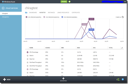 Now we have our SharePoint Farm setup and running, we can visit the cloud services option to monitor the following metrics: CPU, Data In, Data Out, Disk Read Throughput, Disk Write Throughput for our virtual machines, with display metric options.
