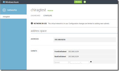 Affinity Group: Create a new Affinity Group called chiragtest (you can substitute for your own). Affinity groups are a way to physically group Windows Azure services together at the same data centre to increase performance. Only one virtual network can be assigned an affinity group.