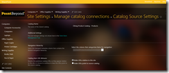 In order to surface the products from the source site collection, we will have to setup a catalog connection. This is done by accessing site settings > Site Administration > Manage Catalog Connections. The entries will only appear here if the search crawl is run successfully. We go ahead and connect to our product catalog (the path is for the source site collection). The catalog source settings page requires few options to configure.