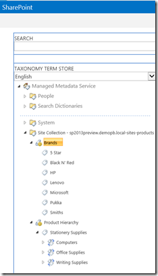 As part of Managed Metadata service, we create product related term sets and terms to control our taxonomy. Product Category and Brand were the term sets followed by the terms as shown below. These are critical as these will form our managed navigation and further have access to faceted navigation settings to customise search refiners (see later).