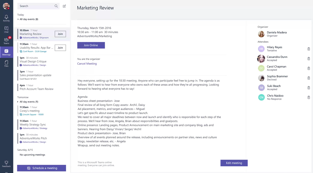 - Make video calls and schedule online meetings – have impromptu or scheduled meetings in any channel, or just call someone…
