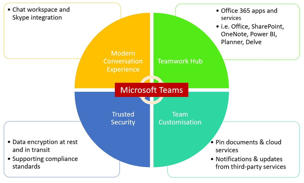 - Team files, notes, and apps in one place – Your team’s tools are organised and integrated in Microsoft Teams with the power of Office 365.