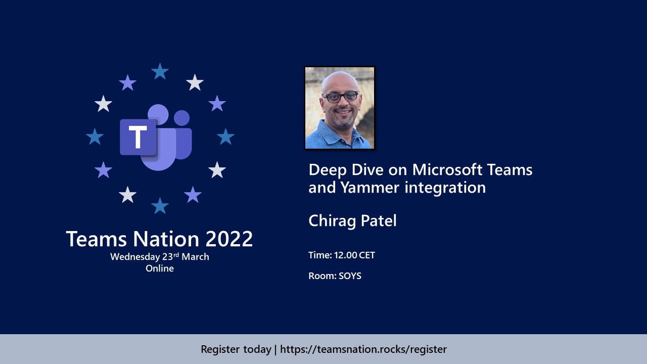 I am excited and honoured to be presenting Microsoft Teams and Yammer integration session on Wednesday 23 March 2022 at TeamsNation! this will be my 5th time since the event began in 2019 and the event just gets bigger, so I’m very thankful to the organisers Chris Hoard @Microsoft365Pro, Vesku Nopanen @vesanopanen, Adam Deltinger @deltanr1, Chris Webb @ChrisWebbTech, Matti Paukkonen @mpaukkon, Paul Dredge @MrPaulDredge for giving me the opportunity to contribute to this great event and their efforts in bringing this event together with community legends Patrick Guimonet, Juan Carlos González and Raphael Koellner.
