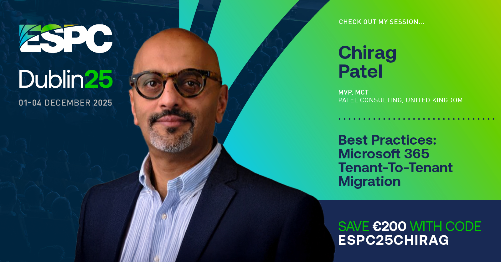 I’m delighted that for the 4th time, I will be speaking at The European SharePoint, Microsoft 365 and Azure Conference (ESPC), as well as being a ESPC25 Reporter! Having presented previously in 2022, 2023 & 2024 on different topics such as Microsoft Viva, SharePoint Premium (Syntex) and migrations. I am looking forward to presenting a session on Best practices of M365 Tenant-to-Tenant migrations and seeing you in Dublin, Ireland on 01-04 December 2025! With over 100 sessions and looking forward to attend some of these and networking opportunities! You can save 200 EUR with code ESPC25CHIRAG off your ticket cost!